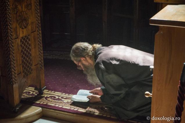 Prima ascultare a celor închinoviați aici este să participe la toate slujbele, fără excepții. Programul liturgic începe la 3.30 și se termină la ora 8 dimineața. De la 8.00 la 10.00, monahii sunt liberi – program de chilie – cel care e mai firav, mai doarme un pic, cel care nu mai are nevoie de somn își face studiul duhovnicesc și pravila. La ora 10.00 e masa principală a zilei și de la ora 11.00 încep ascultările administrative, până la ora 3 după-amiază. La ora 3, din nou la chilie, monahul se pregătește pentru Vecernia de la ora 4. După Vecernie este masa de seară. După masă – Pavecernița. Apoi, până la ora 9 seara, când trebuie să se culce, călugărul este la programul de chilie. Programul de somn este de la 9 la 3. De ce? Fiindcă o oră de somn înainte de ora 12 are valorarea a două ore de somn din cele de dimineață.